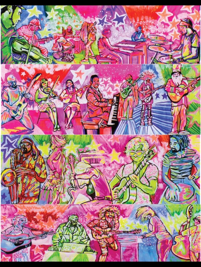 In Spring 2024, Rita Brame and 16 Blocks Magazine produced The Local Jam mural in downtown Blacksburg on the Draper Block. The mural is ~800 Square Feet and features 29 living musicians that have performered on Blacksburg stages.