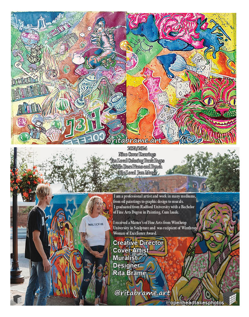 Rita Brame is a Radford and Floyd native and graduated from Radford University with a BFA in Painting and earned an MFA from Winthrop University in Sculpture. She is a lifelong professional artist and designer, and16 Block Magazine’s Creative Director and Cover Artist.